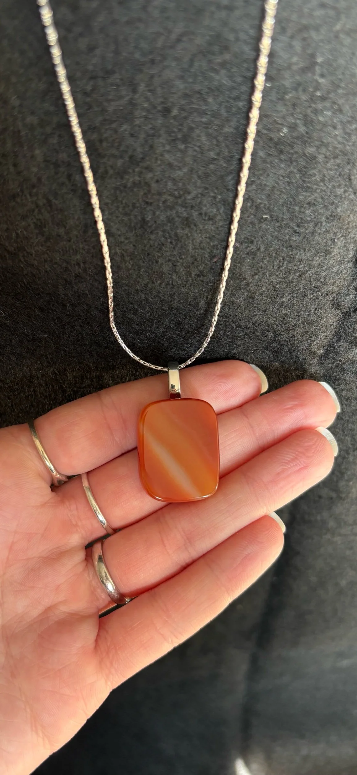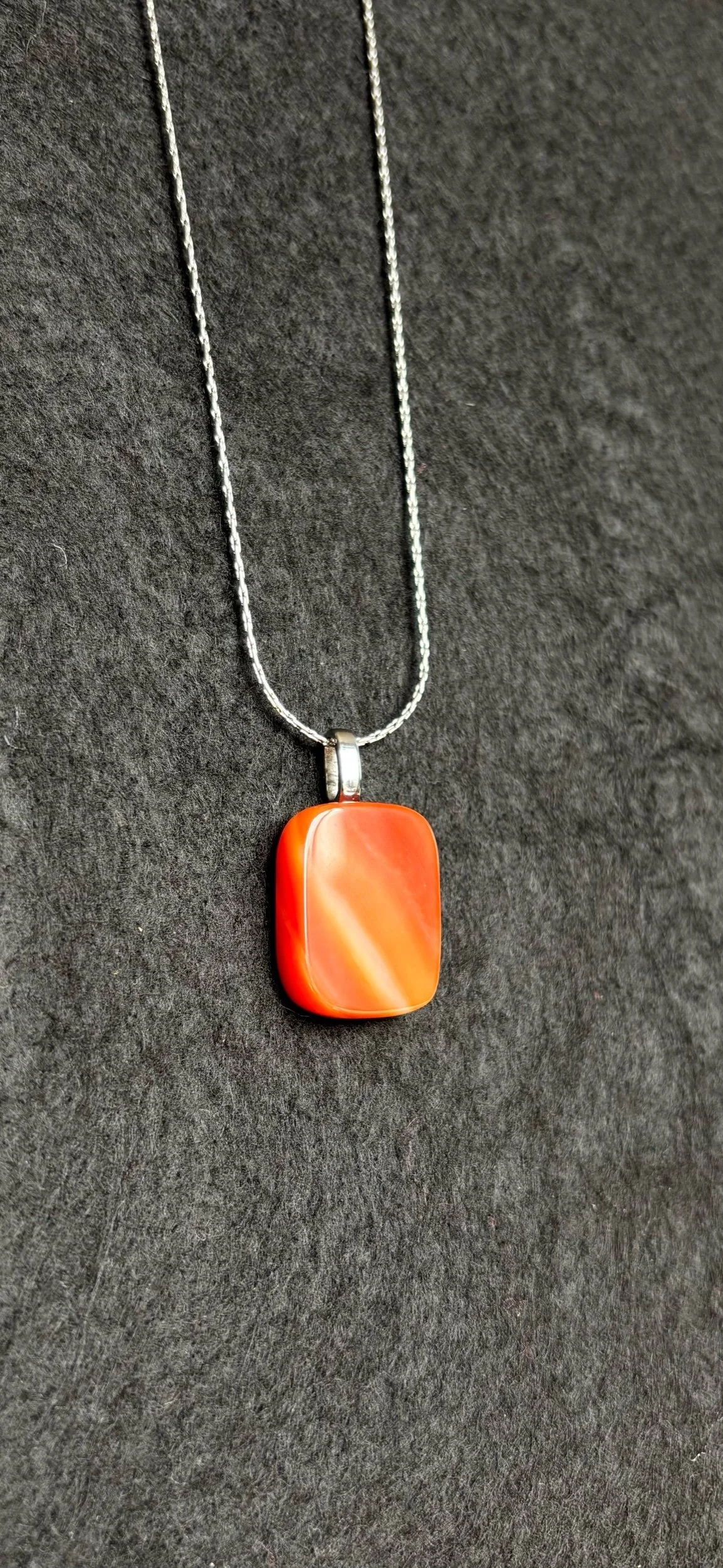 Agate set on a stainless steel bail. Comes with an 18 inch stainless steel chain.